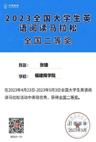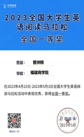 在为期10天(4月23日8点—5月3日8点)的2023全国大学生英语阅读马拉松活动中,beat365学生积极参与,认真阅读答题,取得非常优异的成绩。其中,2020级商务英语专业曾洲桐同学获全国一等奖且排名第一,同样来自2020级商务英语专业的张婕和张雅龙同学获全国二等奖,来自2022级商务英语专业的程俊炜同学获全国三等奖。