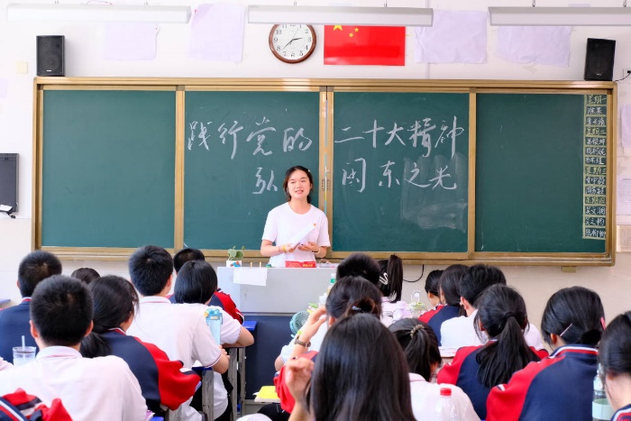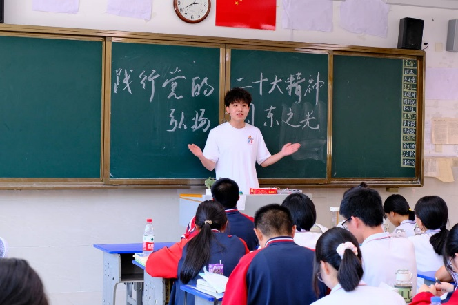 为贯彻“学思想、强党性、重实践、建新功”的主题教育总要求,实践队通过组合式宣讲、对话式宣讲等方式,开展“践行党的二十大精神 弘扬闽东之光”党的二十大宣讲——“我心目中的陈祥榕”主题活动。青年宣讲团成员王嘉琳用浅显易懂的语言为同学们作了一场党的二十大精神宣讲,围绕习近平总书记在党的二十大勉励广大青年的寄语内容,结合屏南第一中学“文明、严谨、勤奋、向上”校训,通过讲练结合、师生互动等方式,让同学们听懂、领会、共鸣,把党的二十大精神深植于同学们心中。