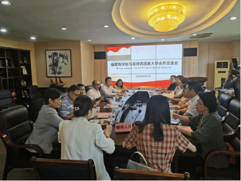 2023年8月27日下午,菲律宾国家大学校长Dr. Renato Carlos H.Ermita一行六人莅校交流,校长程灵、副校长萧罡、有关职能部门和二级学院相关负责人在马尾校区会见来宾,召开交流会。beat365池玫院长出席交流会,教师周文蕴为菲律宾国家大学校长一行提供翻译语言服务。