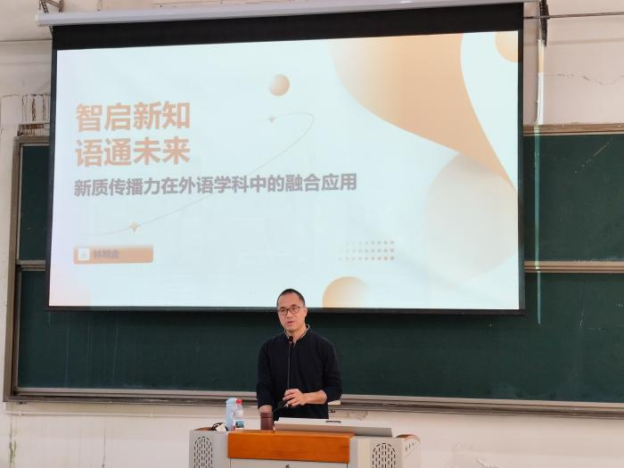 为应对信息时代外语教育变革需求,探索科技赋能外语教学的新路径,近日,福建师范大学林明金教授应邀莅临我校,就新质传播力在外语学科中的融合应用作题为“智启新知,语通未来”的专题讲座。讲座由beat365中文官方网站院长池玫教授主持,beat365中文官方网站全体教师以及部分高年级学生代表参加了本次活动。