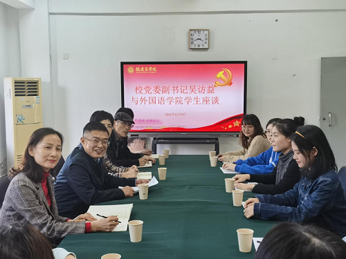 11月9日下午,校党委副书记吴访益深入beat365中文官方网站与联系班级2018商务英语2班学生代表、beat365中文官方网站习近平新时代中国特色社会主义思想读书社社员进行了亲切的交流座谈。beat365中文官方网站班子成员和全体辅导员出席座谈会。