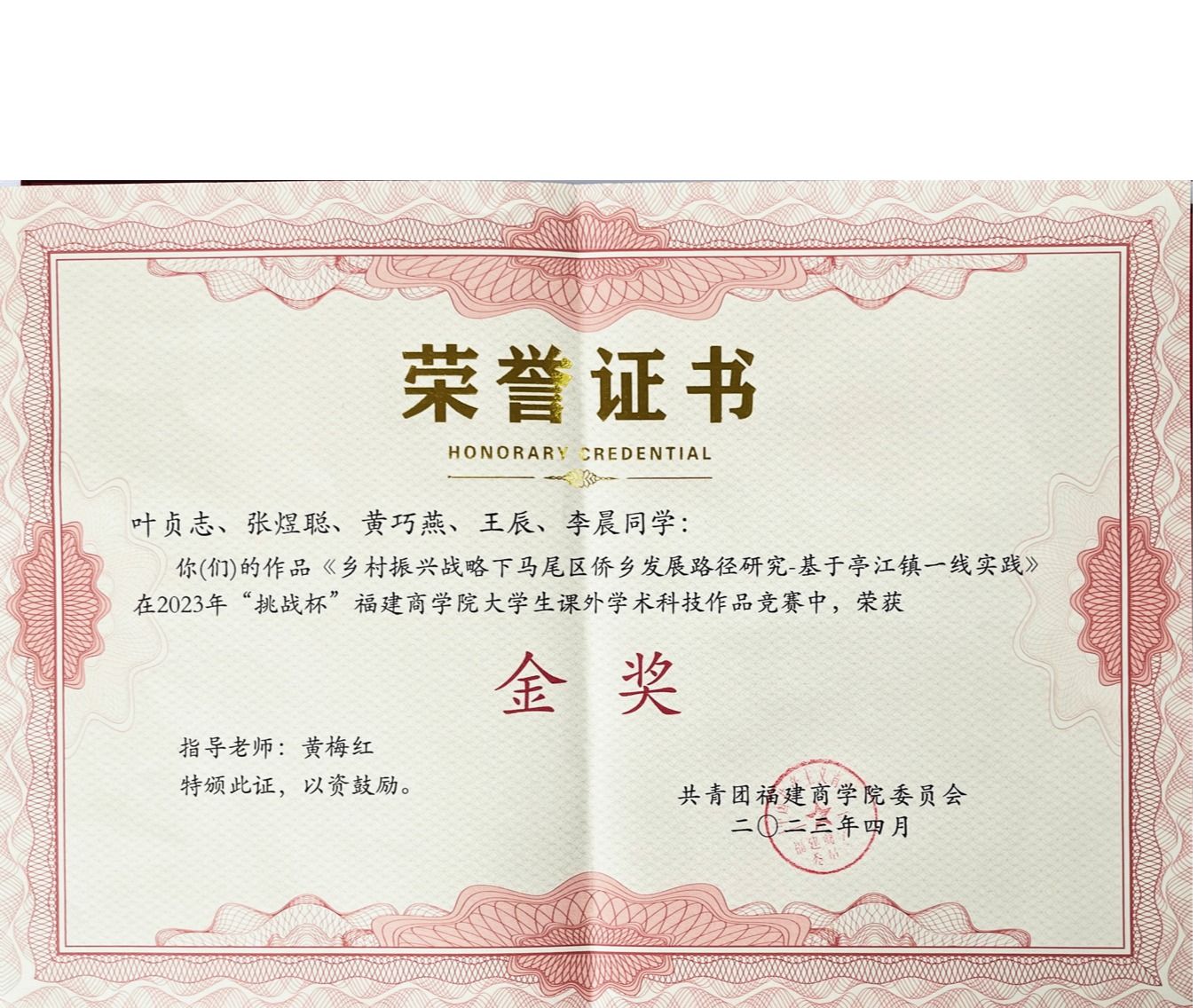 近日,由共青团beat365中文官方网站委员会主办的2023年“挑战杯”beat365中文官方网站大学生课外学术科技作品竞赛在连江校区明德楼落下帷幕。beat36521级日语3班叶贞志、21级日语2班张煜聪、20级日语2班黄巧燕、20级日语1班王辰、20级商务英语2班李晨五位同学的作品《乡村振兴战略下马尾区侨乡发展路径研究-基于亭江镇一线实践》(指导老师:黄梅红),在此次竞赛中荣获金奖。