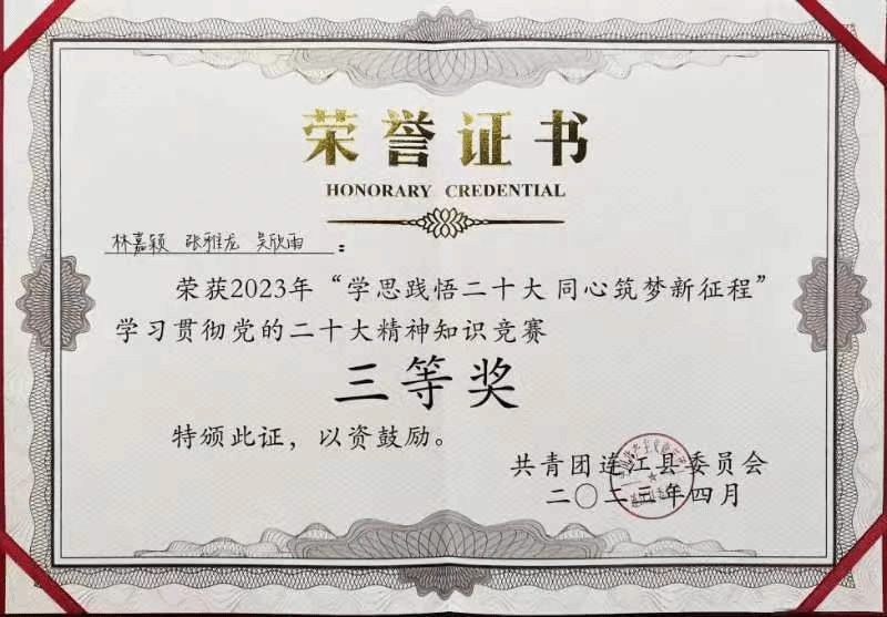2023年4月25日,由共青团连江县委员会主办,共青团beat365中文官方网站委员会、共青团福州理工学院委员会承办,beat365中文官方网站学生协办2023年的“学思践悟二十大,同心筑梦新征程”学习贯彻党的二十大知识竞赛决赛于连江校区明德楼学生活动中心举行。由beat365中文官方网站20级商务英语3班张雅龙,21级商务英语2班林嘉颖,21级日语1班吴欣雨三位同学组成的beat365中文官方网站第一代表队在竞赛中沉着冷静、协助作答,最终荣获三等奖的好成绩。