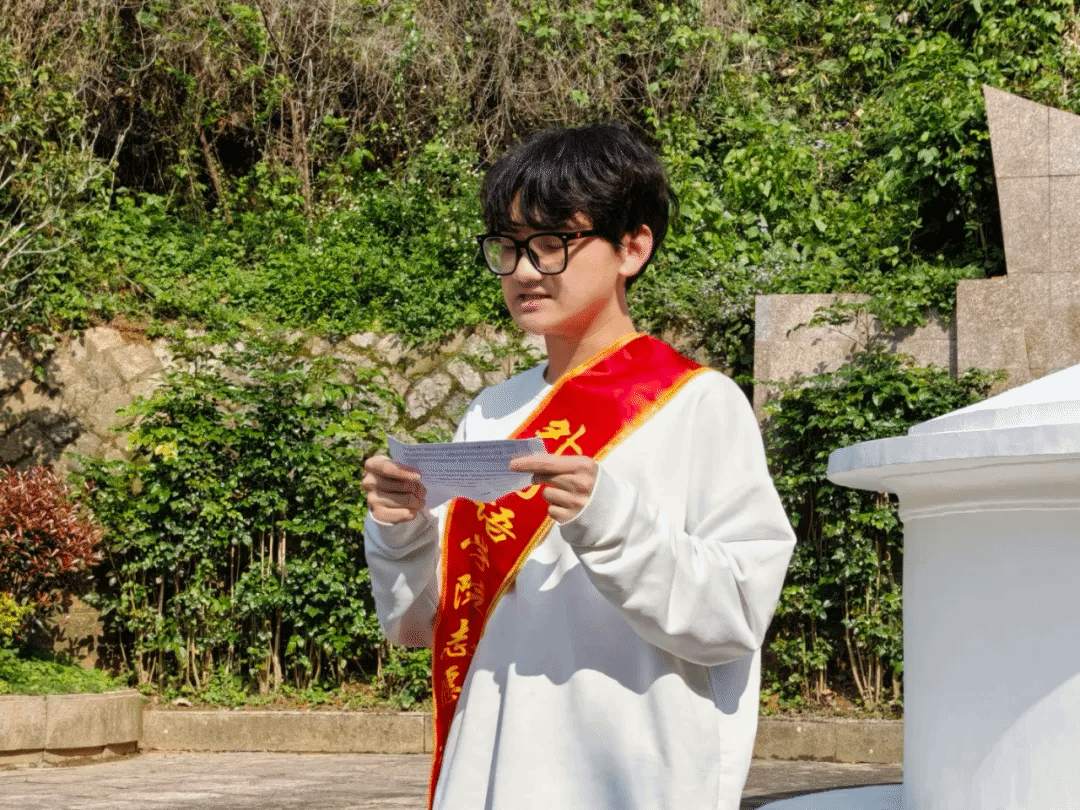 烈士陵园内松柏苍翠,全体人员在纪念碑前肃立,庄严地向烈士们鞠躬、默哀,向为国家和民族献出生命的英烈致以最深切的缅怀。默哀结束后,学生代表薛奕以“赓续先烈志,砥砺青年行”为题,带领师生共同重温革命先烈的英勇事迹,寄托追思之情。先烈们用热血铸就了今日的和平与繁荣,在场的同学们深刻领悟作为新时代青年,应当以“明德、诚信、允能、笃行”的校训为指引,勇担使命,不负时代重托,为实现中华民族伟大复兴贡献自己的力量。