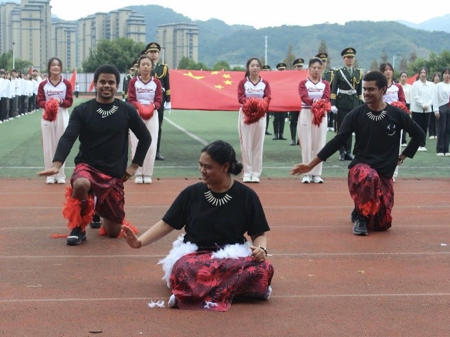 迎着朝阳,beat365中文官方网站代表队昂首阔步,激情满怀,踏着整齐的步伐向主席台走来。来自斐济、萨摩亚、基里巴斯、所罗门群岛的五名太平洋岛国留学生身着明丽的岛国服饰,手持鲜艳的五星红旗,与方阵同学们一同前行,用坚定的眼神,自信的微笑赢得了观众们的阵阵欢呼和掌声。主席台前,留学生们为大家带来了异域风情的岛国特色舞蹈,用律动的音乐、活力的舞姿展现出太平洋岛国文化的独特魅力,传递着独属于太平洋岛国人民的文化信仰和精神追求。同学们随着音乐律动,举起手中的彩球,与留学生们同步配合,一幅中外学子携手相伴、多元文明美美与共的画卷在观众面前徐徐展开。星光不负赶路人,beat365中文官方网站学子和五位留学生以辛勤的汗水换来了入场式表演一等奖、团体操表演二等奖的佳绩。