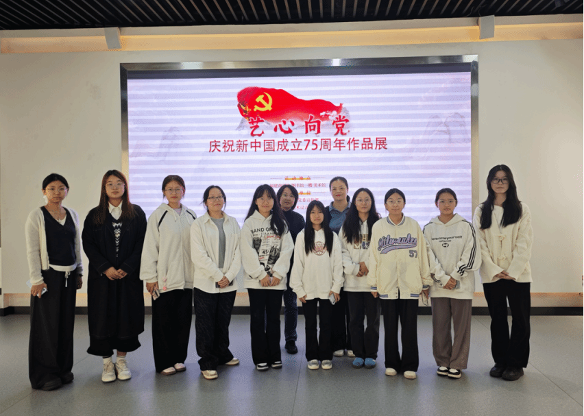 随后师生一行前往艺术馆参观“艺心向党——庆祝新中国成立75周年”作品展。展内陈列了包括海报、书法、国画等多个门类的艺术作品,每个作品都饱含着福商学子对党和国家的无限热爱,讲述了中华人民共和国成立75年来上下求索、风雨兼程、砥砺奋进的光辉历程,热忱描绘新时代、新征程的恢宏气象,歌颂伟大时代的变革与发展,展现了福商学子心系民族复兴伟业,始终坚持听党话、跟党走,践行党的初心和使命,为实现中华民族伟大复兴的中国梦而不懈奋斗的坚定理想。
