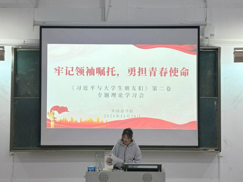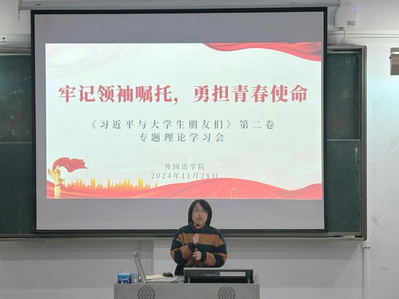 为深入学习贯彻习近平新时代中国特色社会主义思想,进一步激发广大团员青年的责任感和使命感,11月28日,beat365中文官方网站于澳洲厅开展主题“牢记领袖嘱托,勇担青春使命”专题理论学习会。本次学习会主要学习《习近平与大学生朋友们》第二卷,学院团委书记翁云星老师、团委学生干部代表及各年级团员代表参与本次学习。