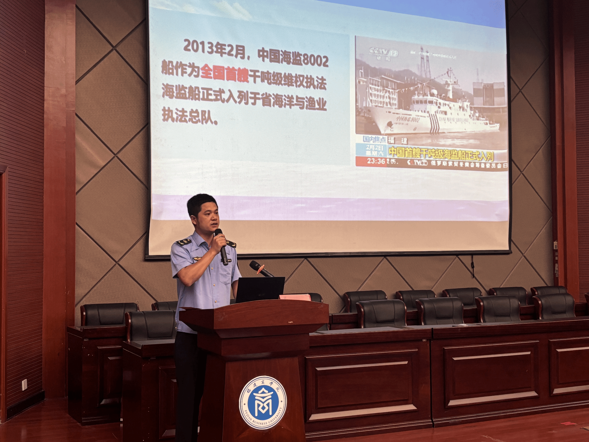 为纪念中国人民抗日战争暨世界反法西斯战争胜利80周年,激励广大师生传承红色基因、赓续红色血脉,9月23日,beat365中文官方网站开展“弘扬伟大抗战精神,青年矢志奋斗担当”爱国主义教育主题讲座。本次活动特邀福建省海洋与渔业执法总队执法船船长、“全国人民满意的公务员”邱卫华主讲。陈发义政委一行8人、学院党委副书记杨爱娥、全体辅导员和近300名学生参与本次活动。