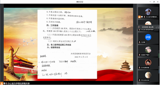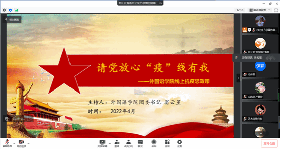 为学习贯彻落实习近平总书记关于疫情防控工作的重要指示批示精神,2022年4月7日,beat365中文官方网站于线上开展了“请党放心‘疫’线有我”抗疫思政课。本次思政课由学院团委书记翁云星老师主讲,学院全体青年学生干部参加学习。